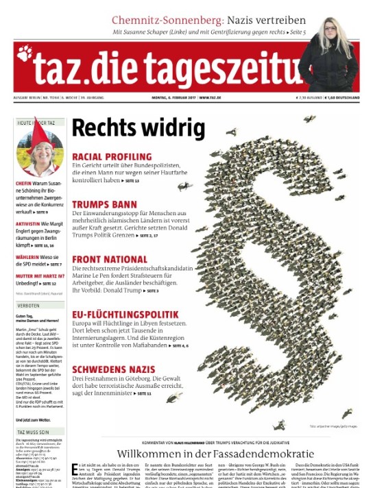 Am Dienstag haben wir für die 1 einen Warnhinweis entworfen, der – die von vielen Lesern mittlerweile gewünscht Trump-freie Zone – verspricht, ankündigt, verlangt. Auch wenn die Zeitung dann voll war mit Texten über die Lage in den USA.